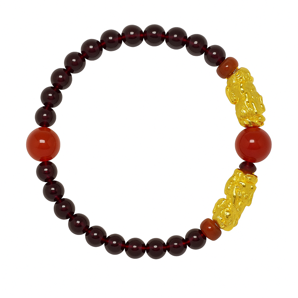Natural Garnet and Agate Bracelet with Vietnamese Gold Pixiu Charms